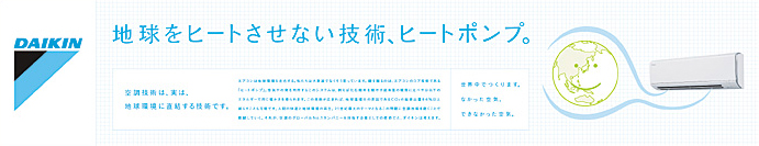 エアコンは地球環境を左右する。私たちは大袈裟でなくそう思っています。鍵を握るのは、エアコンのコア技術である「ヒートポンプ」。空気中の熱を利用するこのシステムは、例えば化石燃料を燃やす従来型の暖房に比べ1/3以下のエネルギーで同じ暖かさを得られます。この技術が広まれば、地球温暖化の原因であるCO2の発生量を6%減らすことも可能です。人間の快適と地球環境の両立。21世紀最大のテーマとなるこの問題に、空調技術を磨くことで貢献していく。 それが、グローバルNo.1を目指す企業としての使命だと、ダイキンは考えます。