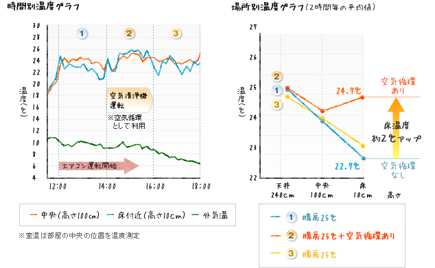暖房だけでは、部屋の上下に温度差ができて、足元付近の温度が約2℃も低くなりました。 |