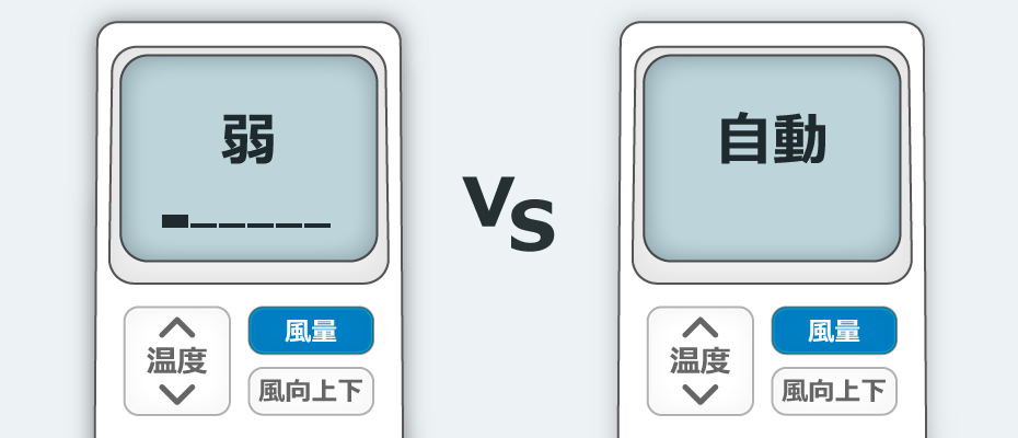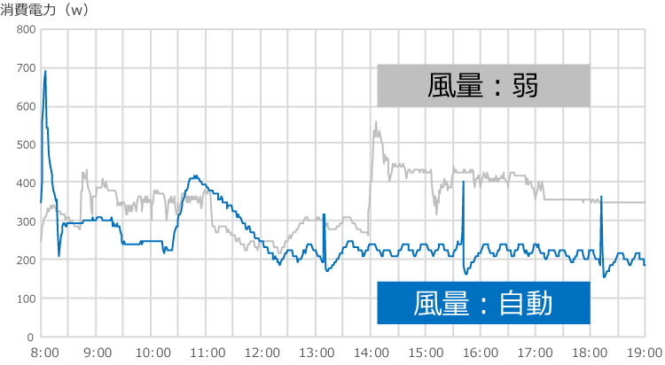 吹出口からの気流が弱い風量「弱」の方が節電につながりそうに思えますが、今回の実験では、風量「自動」の方が節電につながる結果となりました。