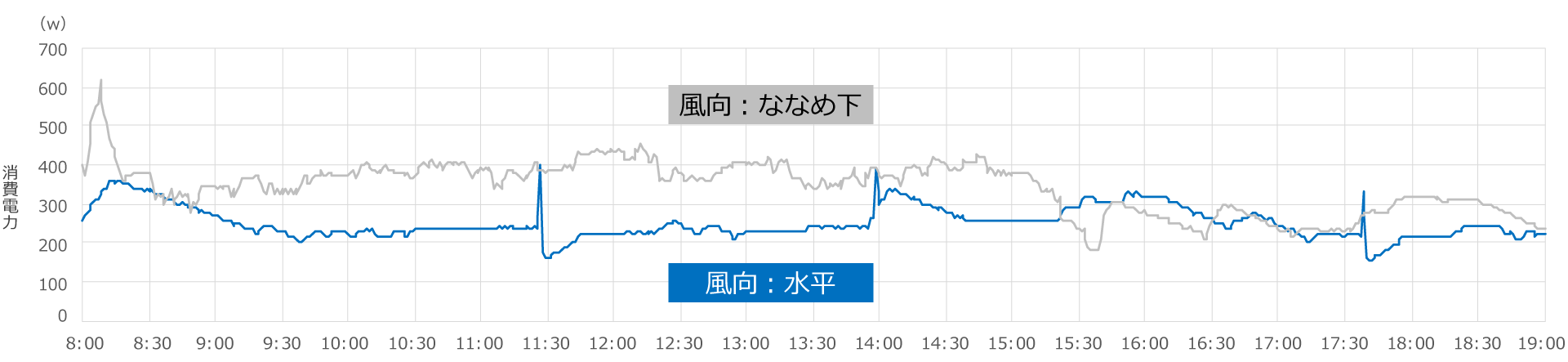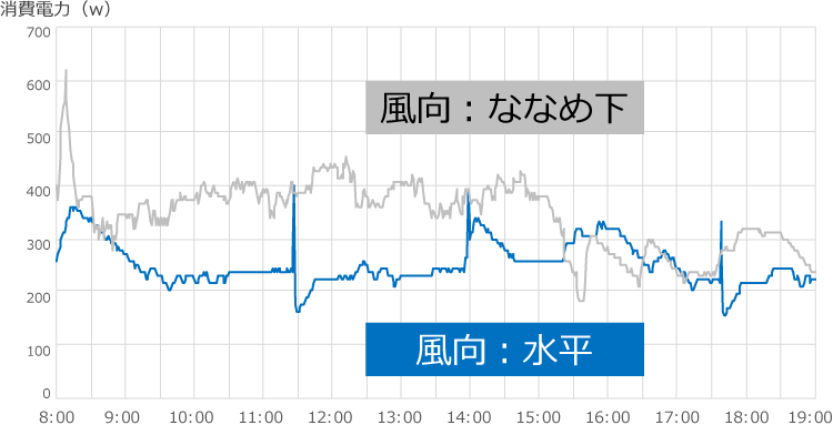 エアコン冷房の風向設定「ななめ下」と「水平」それぞれで、日中11時間(8:00~19:00)つけっぱなしにして消費電力量を計測しました。