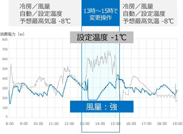 エアコン冷房を使っていても暑く感じることがある真夏の日中(13時~15時)、設定温度を1℃下げるのと、風量設定を「強」にするのとでは、どちらが節電になるのか、消費電力量を計測しました。
