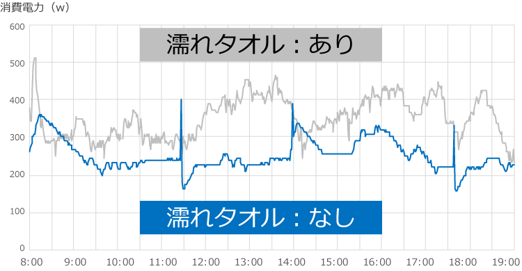 室外機の上の濡れタオル「あり」と「なし」で比べたところ、消費電力量は濡れタオルを被せた「あり」の場合は3.87kWh、「なし」が2.77kWhとなり、今回の濡れタオルの被せ方の場合、濡れタオルが無い方が消費電力量は約3割少ない結果になりました。1か月換算では、電気代が約1,020円の差になります。