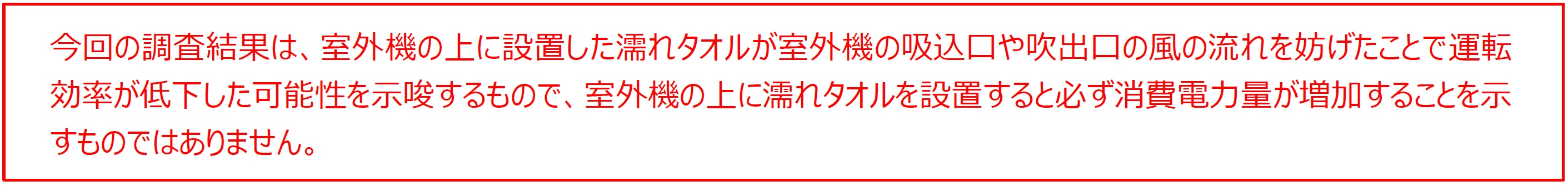 このような結果になる理由は、濡れタオルが室外機側面の吸込口や吹出口の一部に垂れ下がり、空気の通り道をふさいでしまったためと考えられます。エアコンは、室外機の吸込口や吹出口の空気の流れを妨げられると運転効率が落ち、その分余計に電力を使ってしまいます。室外機の上に置いたタオルが乾いて室外機側面に大きく垂れ下がると、吸込口や吹出口のより多くの範囲をふさいでしまい、さらに効率が低下してしまうので注意が必要です。また、室外機に物を載せると、落下の危険や、重さによっては室外機の変形や故障などにつながる場合もあります。