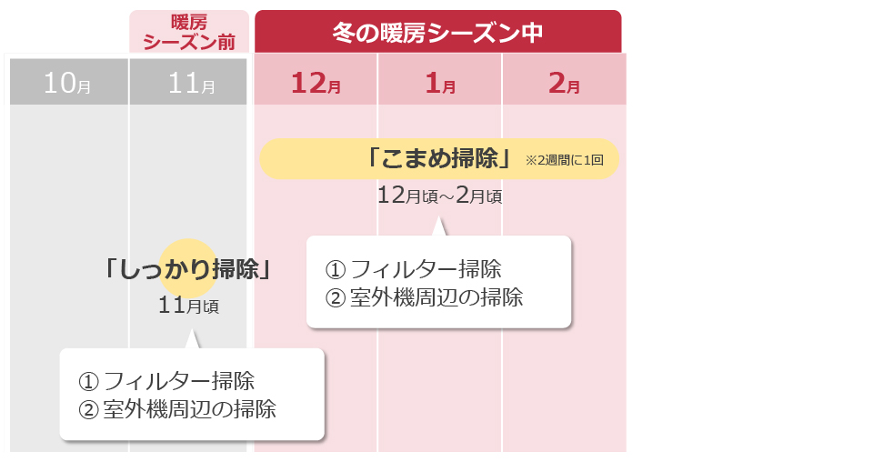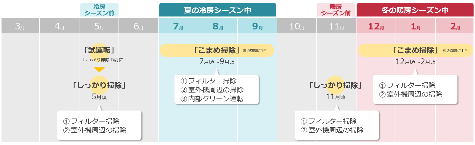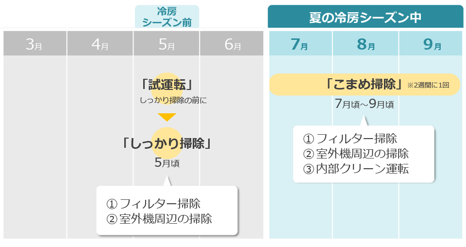 エアコン掃除は、夏・冬のエアコンシーズン(7~9月頃、12~2月頃)に定期的に行う「小まめ掃除」とシーズン前(5 月頃、11月頃)に行う「しっかり掃除」が基本です。