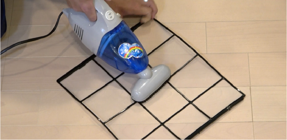エアコン前面のパネルを開けてフィルターを取り外し(写真:上)、フィルターについたホコリを掃除機で吸って(写真:中)から室内機に戻します。これをシーズン中のフィルター掃除は2週間に1回のペースで行いましょう。