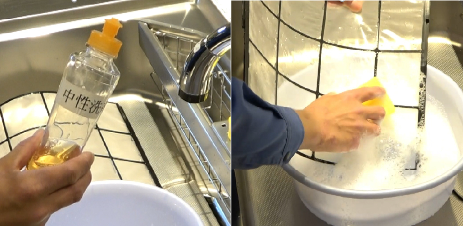 また、エアコンがキッチンからの油煙を吸い込むなどでフィルターの汚れがひどいときは、台所用中性洗剤を溶かしたぬるま湯で洗い(写真:下)、十分に陰干ししてから室内機に戻しましょう。
