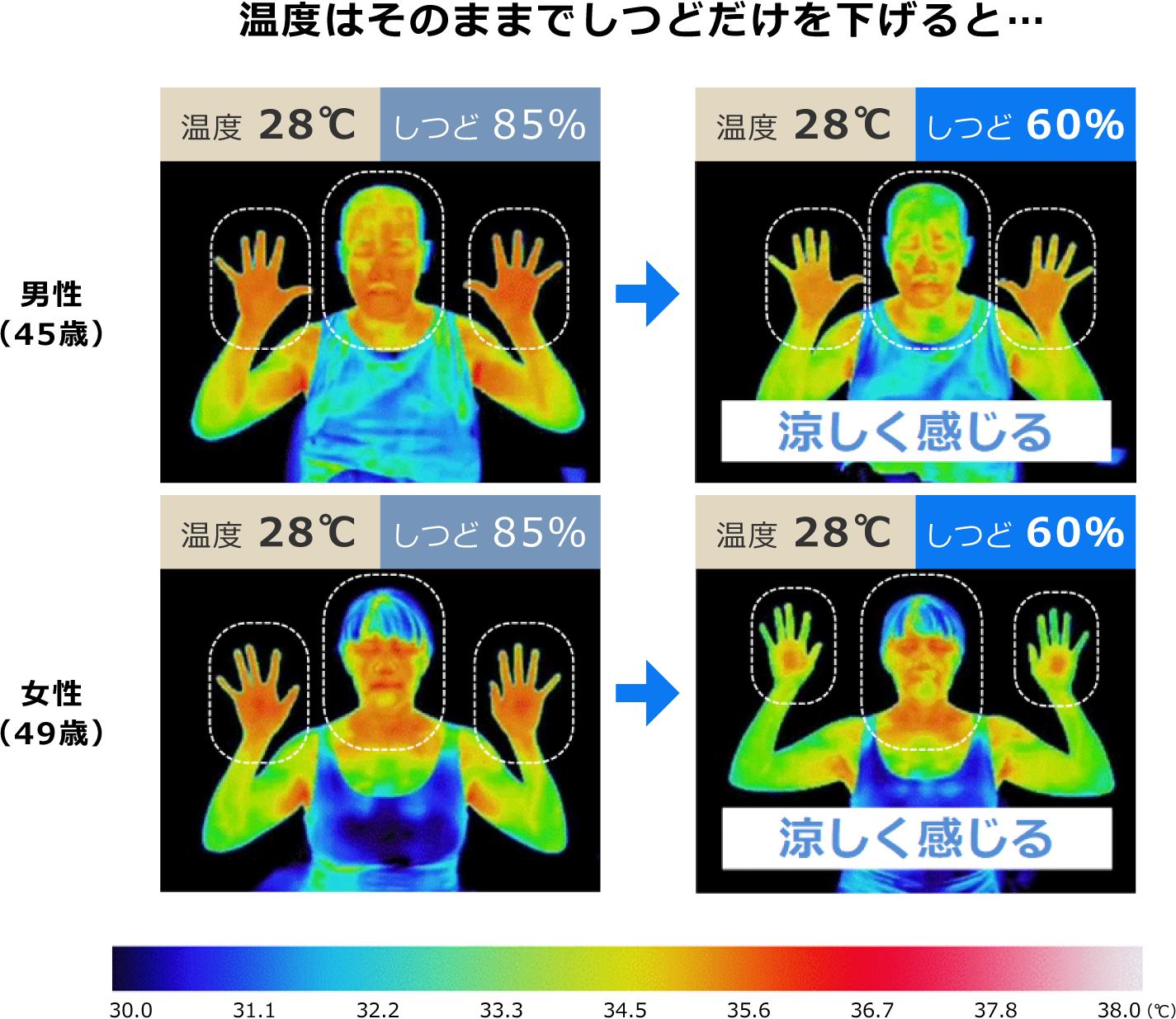 今回の可視化検証試験では、同じ温度(28℃)でも、湿度が高い(85%)と暑く不快に感じ、湿度が低い(60%)と快適に感じる様子が男女ともに観察されました。このようになる理由は、湿度が低いと体温調節のために発せられた汗が蒸発し気化熱により体温を下げるのに対し、湿度が高いと汗が蒸発しにくく、十分に体温を下げることができずに更に汗をかき、より暑く感じてしまうためです。湿度が20%違うと体感温度は4℃違うと言われています。つまり、温度を変えなくても湿度をコントロールすることで、熱中症対策や男女の温度に対する性差の解消につなげることができます。