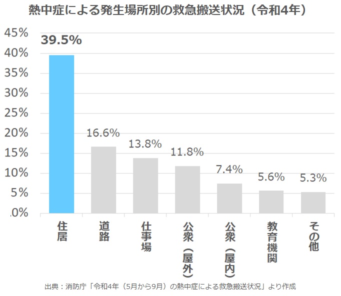 こうした熱中症は屋外で発生しやすいと思いがちですが、実は室内でも油断できません。総務省消防庁によると、熱中症発生場所のうち最も多いのは約4割の「住居」で、2022年は39.5%となっています。