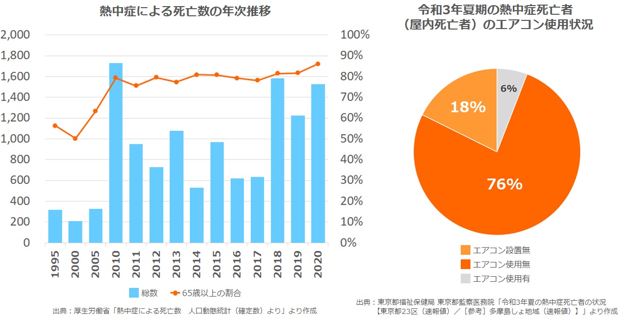 厚生労働省人口動態統計に示される熱中症による死亡者数は1994年以降増加しています。毎年平均で600人以上の方が亡くなり、近年では1,000人以上が亡くなる年が続いています。