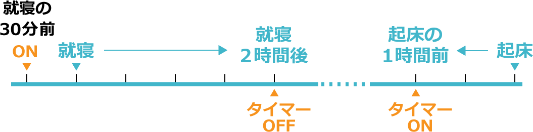 気温は深夜から明け方にかけて最も低くなるため、就寝中もエアコン暖房はつけたままにしておくことをおすすめします。また、最近のエアコンには、睡眠直後は温度を高めに、その後は2℃程度下げ、起床前にはまた高めにするというように、睡眠時の体温変化に合わせて自動で適切な温度に設定してくれる機能を搭載したものもあるので、それらを活用するのもよいでしょう。 エアコン暖房をつけたままにしたくないという方は、エアコンのON/OFFタイマーを組み合わせる形で、就寝30分前から2時間運転した後にOFF、そして起床する1時間前にONになるよう設定するのがおすすめです。