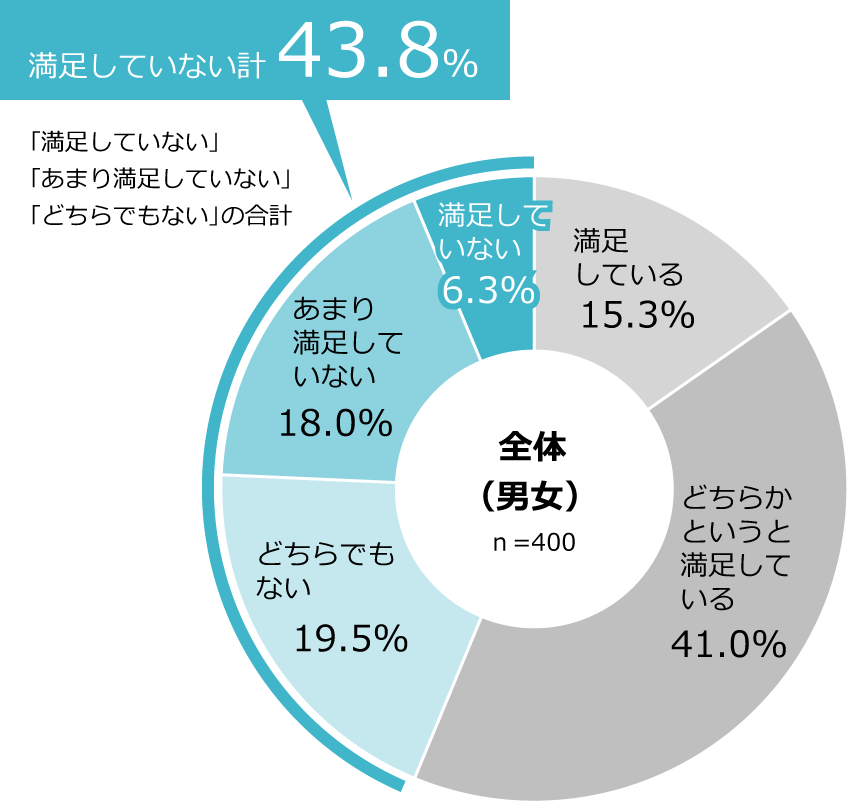 冬の睡眠に対する満足度を聞いたところ「満足している」(「満足している」「どちらかというと満足している」)と答えなかった「満足していない人」(「満足していない」「あまり満足していない」「どちらでもない」)の割合は約4割(43.8%)でした。