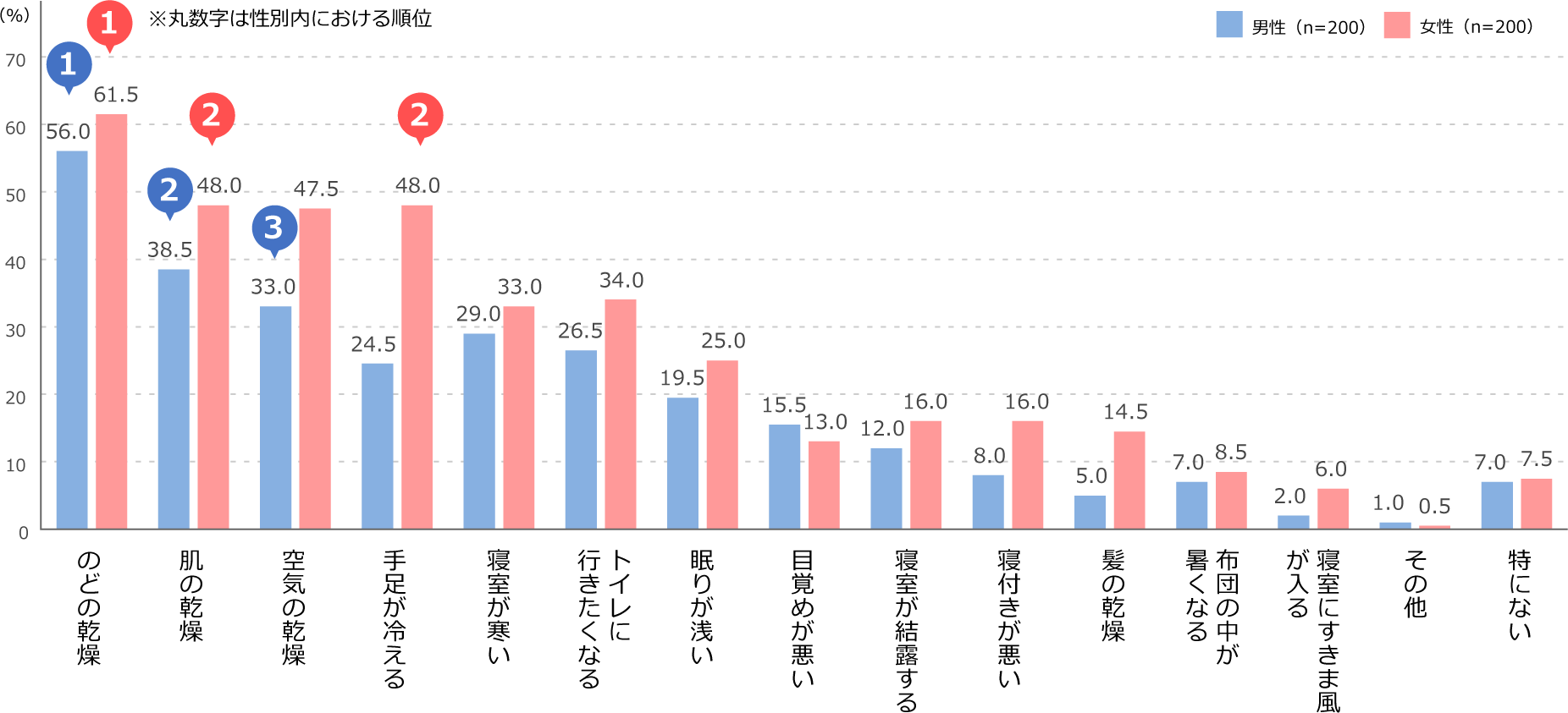 日本の冬は乾燥して寒い。そしてこれは寝室も同様です。冬の睡眠時に困っていることについて聞いたところ、男性で最も多かったのは「のどの乾燥」(56.0%)で、「肌の乾燥」(38.5%)、「空気の乾燥」(33.0%)が続きます。女性で最も多かったのは男性同様「のどの乾燥」(61.5%)でしたが、次に多かったのは「手足が冷える」「肌の乾燥」(48.0%)でした。「乾燥」「寒さ」は冬の睡眠時の二大困りごとといえそうです。