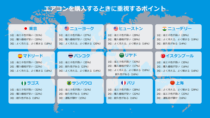 世界の人々に、「エアコンを購入するときに重視するポイント」について聞きました。空気と環境
