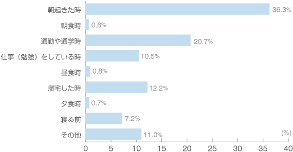 1日の中では、「朝起きた時」(36.3%)と回答した人が最も多く、次いで「通勤や通学時」(20.7%)、以下「帰宅した