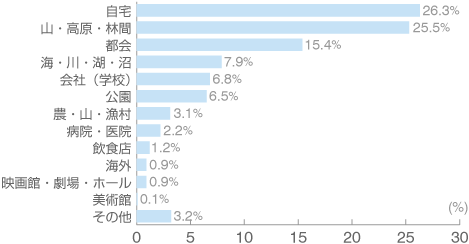 場所では、「自宅」(26.3%)と回答した人が最も多く、次いで「山・高原・林間」(25.5%)の順となっています。以下、「都