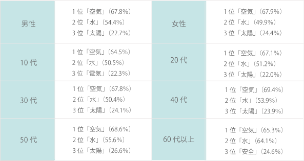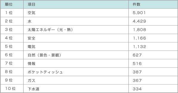 日常生活の中であまりコストを意識しないものは何か、自由に3つ回答してもらったところ、1位「空気」(5,901件)、2位「水」(4,429件)が圧倒的に 多く、昔から3大無料(タダ)ものにあげられていた「安全」・・・ 全体をみる