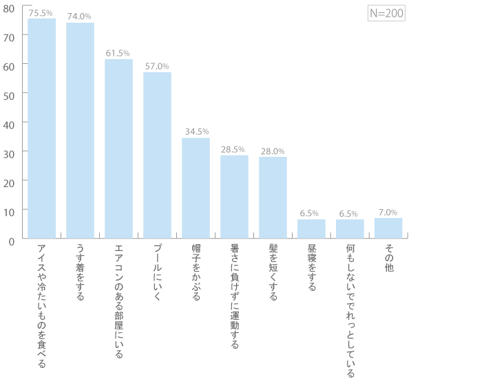 7割強が「アイスや冷たいものを食べる」(75.5%)をあげており、「薄着をする」(74.0%)が続いていますが、その一方で