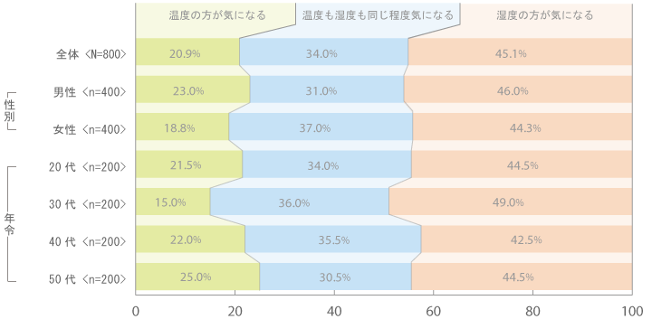 夏の部屋の空気では、温度と湿度のどちらがより気になるかを聞いたところ、「湿度の方が気になる」(45.1%)が半数弱を