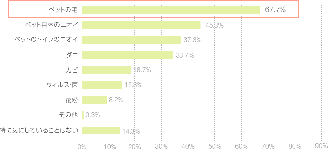 ペットと共生する室内の空気に関して、気になることを聞いたところ、「ペットの毛」が1位(67.7%)となりました。・・・