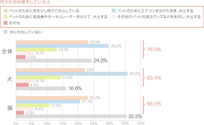 「夏場に外出する際、ペットのいる室内環境をどのようにしていますか」と聞いたところ、76.0%の飼い主が何らかの暑さ対策をしており、「特に何もしていない」という24.0%を大きく上回る結果となりました。・・・ 全体をみる