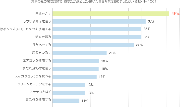 東京の夏の暑さ対策で、あなたが感心した・驚いた対策はありますかと聞いたところ、1位は「日傘をさす(46%)」でした。日本では多くの女性が暑さ対策、・・・ 全体をみる