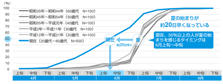 ▼現在の東京の夏の始まりのタイミングは6月上旬~中旬(折れ線は夏の始まりを感じた人の累積)
