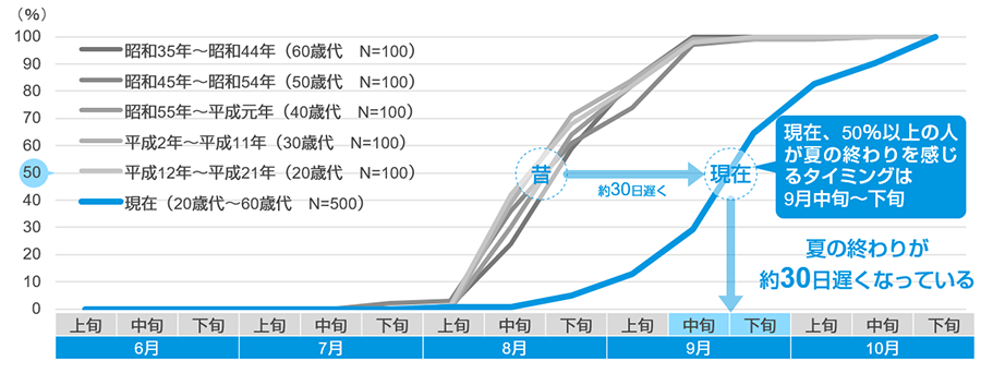 ▼現在の東京の夏の終わりタイミングは9月中旬~下旬(折れ線は夏の終わりを感じた人の累積)