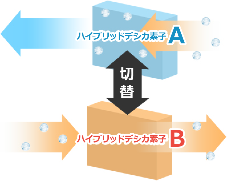 2つの「ヒートポンプデシカント」を連結させることで水の「吸着」と「放出」を交互に行います。