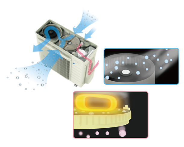 室外機が空気中にある水分子を集め、きれいな水だけを室内に送ります。だから給水なしでも加湿が可能です。