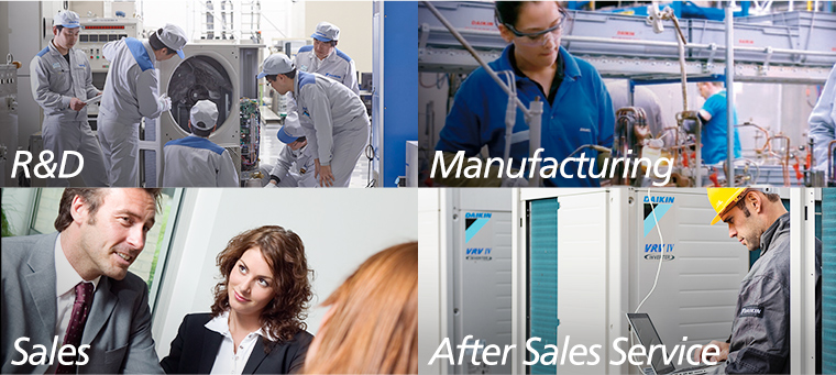 ダイキンは世界で唯一、冷媒から機器開発、製造・販売、アフターサービスまでを自社で行う総合空調メーカーです。「温度」 「湿度」「気流」「空気清浄」という、空調の四要素を自在にコントロールすることで、 地域や気候、文化ごとに異なるニーズにお応えしている、空気のスペシャリスト集団です。