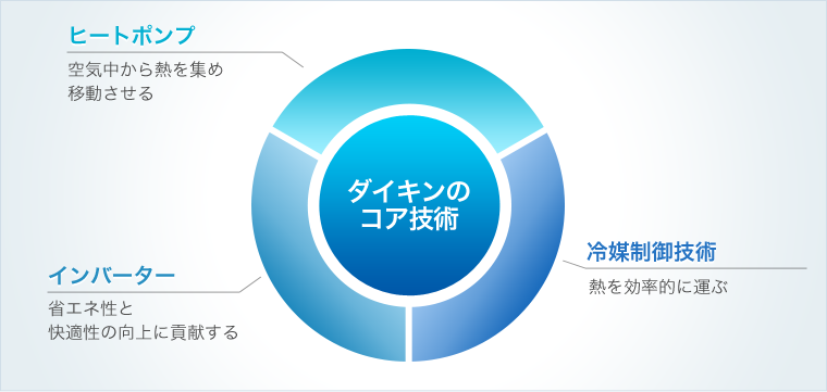 ダイキンが独自に培った3つの高度な空調コア技術により、次世代技術の基礎を築いていきます。