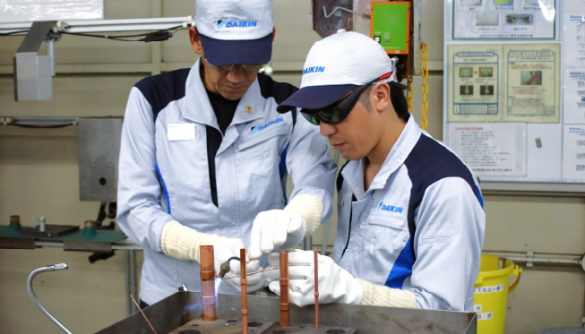 モノづくりを支える人の育成には、ろう付けなど、品質を左右する重要な技能と知識を、熟練技能者から若い技能者へ継承する、マイスター制度を取り入れています。高度に熟練したものにマイスターの称号を与え、堺製作所内のみならず、世界中の従業員に技能を伝承することで世界最高品質のモノづくりを可能にしています。