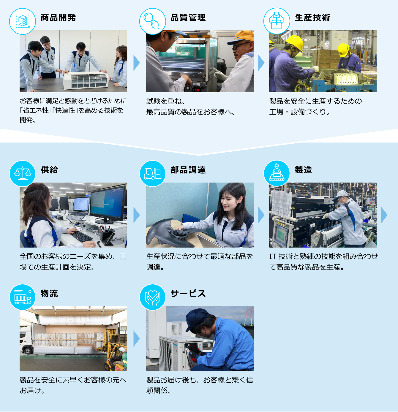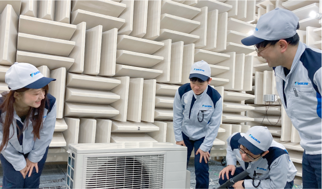 エアコンから空気清浄機・給湯器など、時代に合わせたニーズに応えるため、さまざまな製品を開発し続けています。製作において、各部門が支え合い一丸となって、お客様に安全安心な「商品」をお届けするのはもちろん、地球環境にも配慮。人にも自然にも優しい製品開発を行っています。