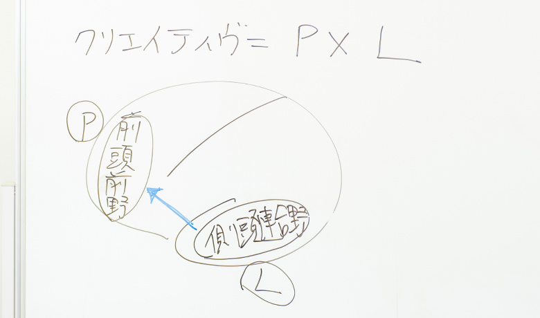 「優れたクリエイターには2つの条件があって、1つは側頭連合野に経験がたくさん蓄えられていること。その意味では経験者のほうが有利ですね。そしてもう1つがそれらを前頭葉でうまく引き出せること。意欲や既成観念にとらわれないことなど、こちらは基本的には若手のほうが有利なんです。グラフにすると、経験を積めば積むほど側頭連合野のほうは上がっていくのですが、前頭葉の引き出すほうは経験を積むと下がっていく。