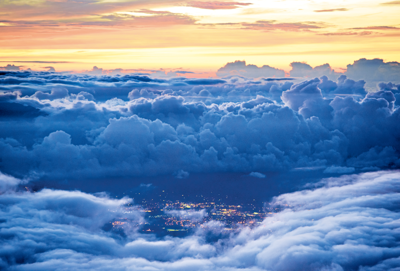 標高約3,000m。 太平洋から突き出たようなマウイ島・ハレアカラ山。 山頂の空気は薄く寒暖の差が激しい。 雲間から眼下に人里の灯りが見える。 なぜか懐かしくあたたかい。 雲や風や、いろんなものを含んだ空気が、人の暮らす場所を穏やかに守っていた。