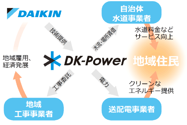 DK-Powerは、自治体が保有する水道施設にマイクロ水力発電システムを設置し、管理・運用・売電をします。様々な自治体の水道事業者や、地域の工事事業者、送配電事業者と協力し、再生可能エネルギーによる発電事業に取り組みます。エネルギーの地産地消につながる可能性のあるサステナブルなエコシステムです。