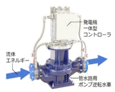 当社が開発したマイクロ水力発電システムは、空調・油圧機器の省エネ商品開発で培ったモーター技術やインバーター技術、流体解析技術を応用し、水車と発電機をパッケージ化した、小型で低コストの発電システムです。
