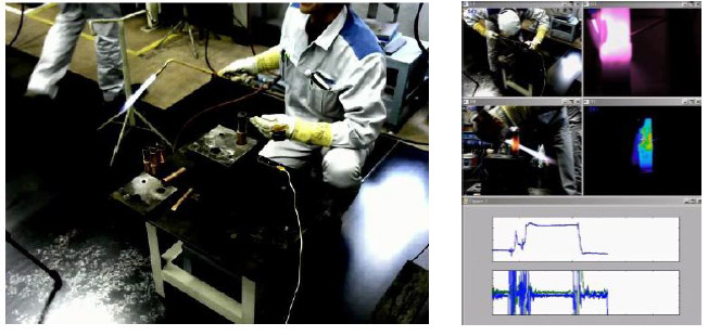 ろう付け作業(写真左)と画像解析技術を用いたろう付けプロセスのセンシング例(写真右)