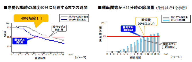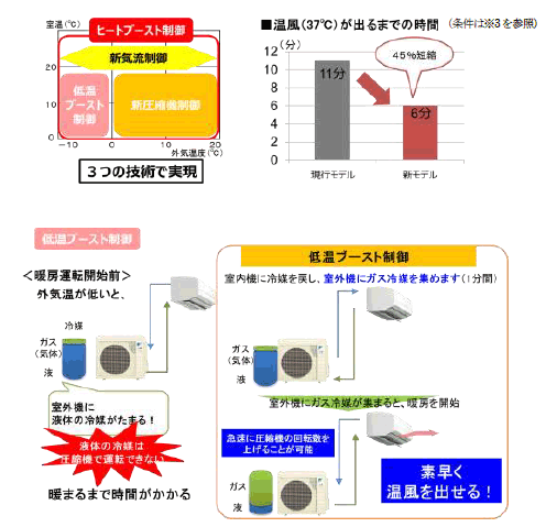 本商品は、快適性を向上させる各機能の効果を、エアコンの運転開始後にいち早く発揮させるため、冷媒を加熱、冷却する圧縮機の性能を従来以上に引き出す新たな制御を組み込みました。暖房時の「ヒートブースト」制御では、設定温度への到達時間を約20%短縮します。冷房時の「クールブースト」制御では、夏場の不快感の要因となる湿気を素早く除去します。