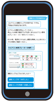 第一弾として、夏場や冬場に最もお問い合わせの多い家庭用ルームエアコンの故障診断サービスを開始します。「運転しない」「冷えない」などのエアコンの不具合の症状について、画面上に表示する質問にユーザーが答えていくことで、故障の診断結果がわかります。サービスエンジニアの訪問が必要と診断された場合は、修理料金の目安が提示され、そのまま修理の申し込みをすることも可能です。