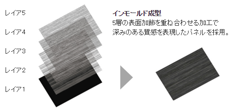 樹脂素材の無機質な質感をそのままにせず、正面パネルの上にプリント柄を何枚も重ね合わせるインモールド成型技術を採用しました。この技術で表現された豊かで深みのある木目や織目などの質感が、多彩なインテリアとの調和を生み出します。