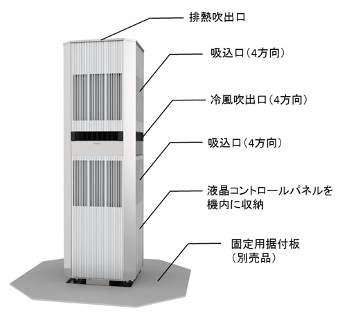 本商品は、タワー形の本体の側面中央から冷風を前後左右の4方向に向けて約3m先まで届けることで、屋外に涼しい空間(クールスポット)を創造します。一般的なエアコンにおける室内機と室外機が一体となった構造になっており、室内機と室外機をつなぐ冷媒配管工事が不要のため、設置が簡単で、場所も選びません。