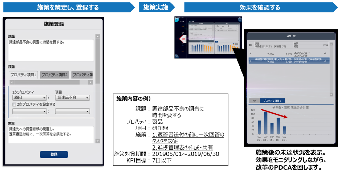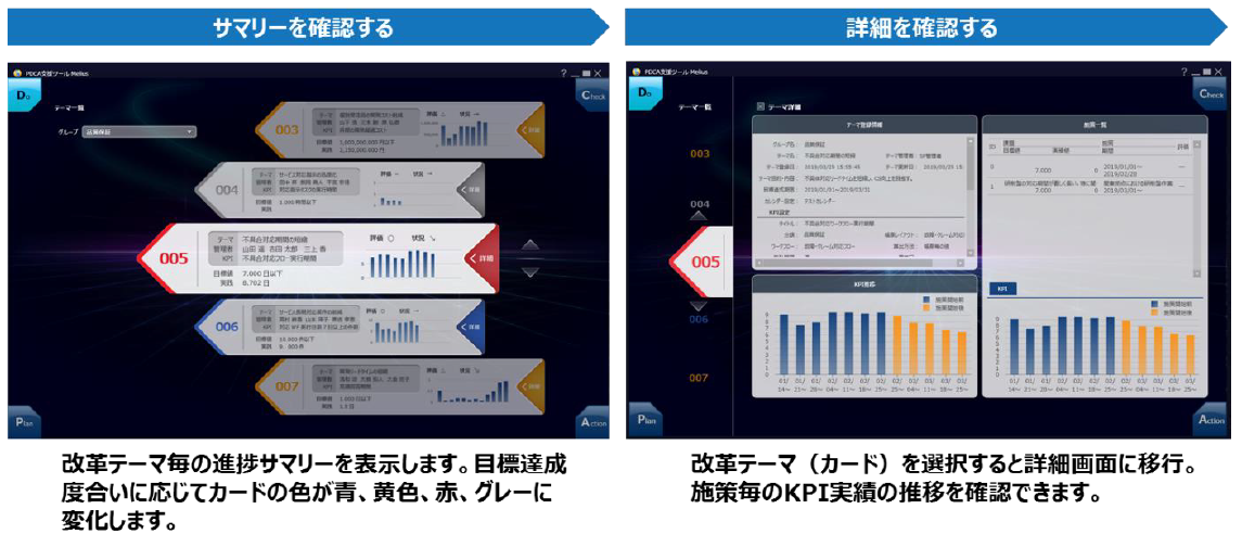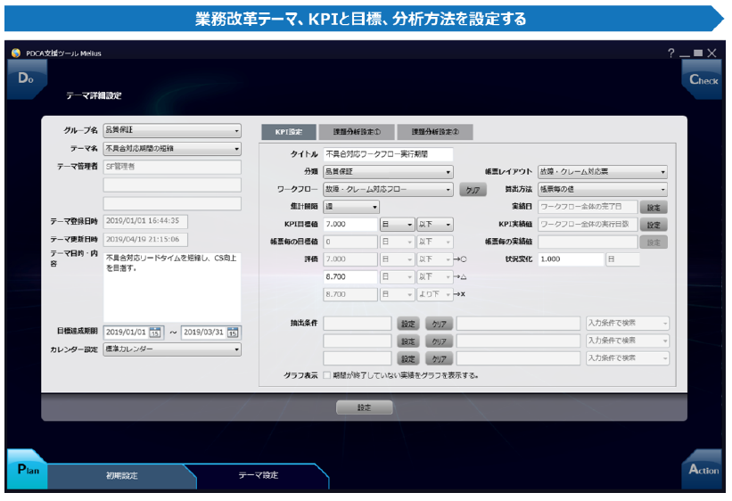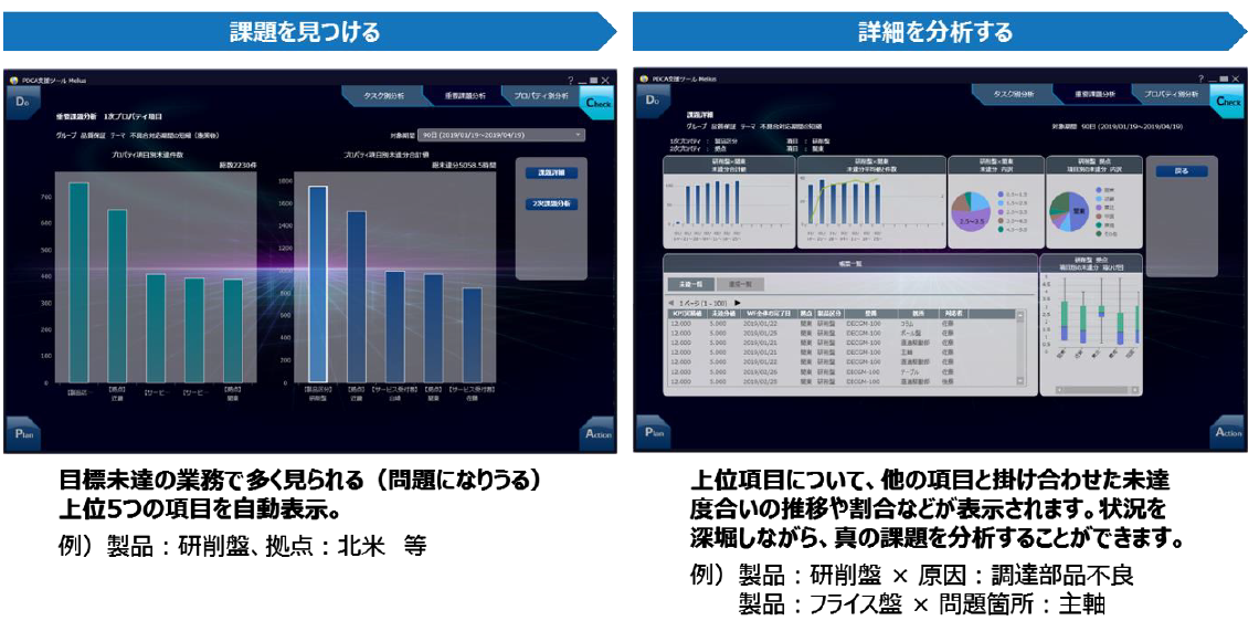 今回新たに追加した「PDCA支援機能Melius」は、(1)業務改革のテーマ策定(Plan)、(2)改革達成状況の確認(Do)、(3)課題の分析(Check)、(4)分析結果に対する新施策の立案と実行(Action) を支援します。開発拠点、製品、型番、不適合の原因など、『SpaceFinder』に蓄積された業務プロセス上の様々な情報の中からユーザーが設定した評価指標(KPI)の目標値に対して、達成状況を示すとともに、未達の原因と考えられる条件を自動で抽出し、真の課題の所在特定につなげます。業務改革のベースとなるPDCAサイクルの効率化を促し、企業競争力を高めるための継続的な業務改革の高度化を実現します。