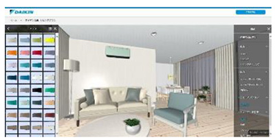 また、2019年4月1日に公開したWebツール『risora 3Dシミュレーション』にも、10種の質感を持つ『risora』を新たに追加しました。44色の『risora』室内機と382種類の壁紙、63種類の天井材、544種類のカーテン、12色のソファ、531色の床※3を3Dの室内空間で自由に組み合わせ、自分好みのインテリアをシミュレーションできます。CADなどの専門的な知識を必要としない本Webツールは、直感的な操作やプランボード作成機能により、ユーザーやインテリアコーディネーター、住宅設計士まで、幅広い職種での活用が可能です。