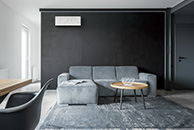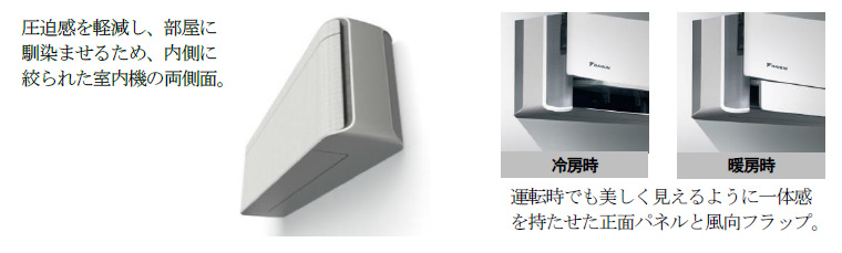室内機の横幅は国内の住環境に適した半間に納まる798mmにしながらも、室内機の厚みを業界最薄の185mmに抑えました。また、形状は極力シンプルに、さらに室内機の両側面を内側に絞り込むことで、圧迫感の軽減を追求しました。さらに、エアコン運転時に正面パネルや風向フラップが動いても、機能性を犠牲にすることなく美しさを保つ構造を新たに採用しました。
