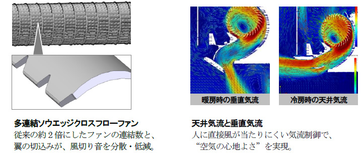 室内機の薄さを追求し、室内機内部の空間が狭くなると、従来のファンではファンの回転による異音が発生します。『risora』は、新たに開発した多連結ソウエッジクロスフローファンを搭載することで、風量を抑えることなく静音性を確保しました。また、当社の最上位機種『うるさら7』で培った気流技術を活かした冷房時の「天井気流」と暖房時の「垂直気流」を搭載し、人に直接風が当たりにくい気流制御と、設定温度到達後も温度だけでなく湿度も制御し続ける「プレミアム冷房」、プラズマ放電の一種であり、およそ100,000℃の熱エネルギーに匹敵する酸化分解力を持つストリーマをエアコン内部に照射し、カビ菌・ニオイの原因菌を分解・除去する「ストリーマ内部クリーン」により、空間だけでなく“空気の心地よさ”を実現しました。