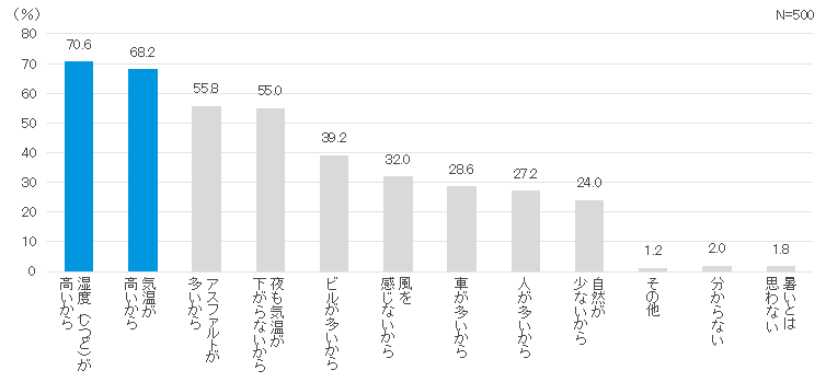最近の東京の夏の気温が高いことは事実ですが、暑く感じるのは気温が高いからだけなのでしょうか。「あなたは、最近の東京の夏が暑いのはなぜだと思いますか」と聞いたところ、最も多かったのは「湿度(しつど)が高いから」(70.6%)で、「気温が高いから」(68.2%)を上回る結果となりました(図3)。