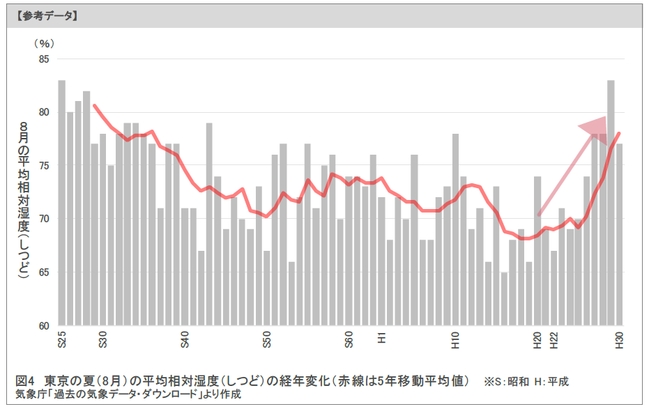 そこで、東京の夏(8月)の平均相対湿度(しつど)の推移を見ると、昭和25年(1950年)から減少~横ばいで推移していましたが、平成19年(2007年)頃からは上昇に転じています(図4)。つまり、最近の東京の夏の暑さは、温度の上昇に加えて、この湿度(しつど)の上昇が関係しているものと推測されます。東京生まれ・東京育ちの人たちは、東京の夏の湿度(しつど)の高さを敏感に感じ取っていると言えそうです。
