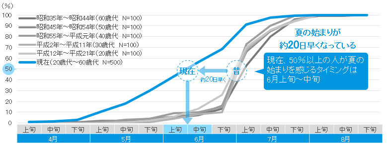 図5 現在の東京の夏の始まりのタイミングは6月上旬~中旬(折れ線は夏の始まりを感じた人の累積)