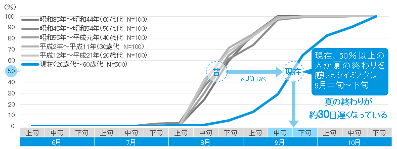図6 現在の東京の夏の終わりタイミングは9月中旬~下旬(折れ線は夏の終わりを感じた人の累積)